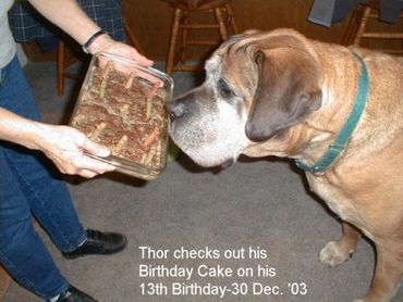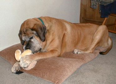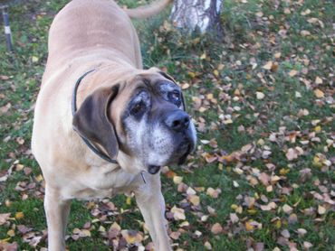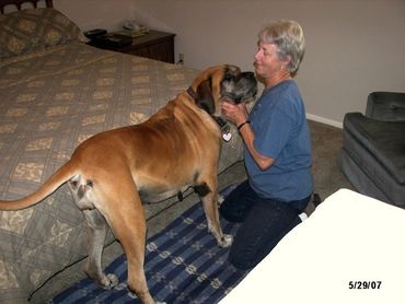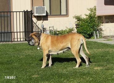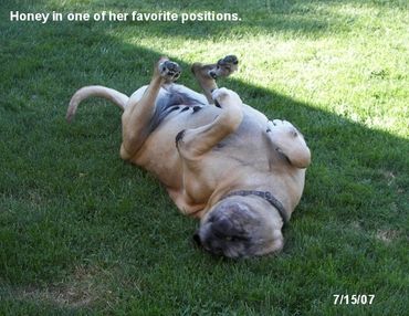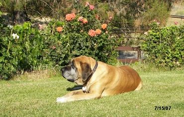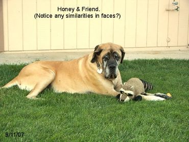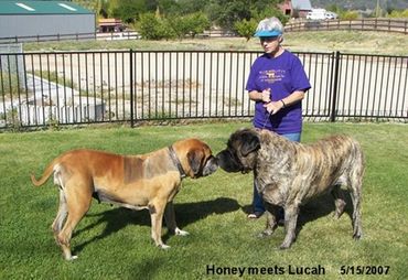 Ron and I were heavily involved with MCOA Rescue both in S. CA and after our move to Atascadero in San Luis Obispo County. We fostered more than 70 Mastiffs over a 6 year period as well as numerous other breeds while I was volunteering at our local Animal Shelter. Since we had usually 3-5 Mastiffs of our own, I was careful not to keep any of the dogs that came thru our house….with three exceptions…Thor, Noah and Honey. They had many things in common. They all came out of shelters as strays or owner turn in. They were all seniors and they all had PRA (a retinal disease leading to blindness). Most important, they all had wonderful temperaments.